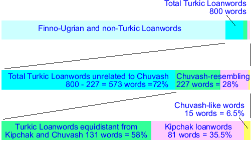 This leads to a logical question: how to explain the presence, among these loanwords, of the several words with the Chuvash features? It can't be explained that the Bulgars are the ancestors of the Chuvashes, for neither the linguistic, nor the ethnographic, nor the anthropological data corroborate this postulate. Evidently here at work are the laws of the word borrowing process: like in the formation of the Chuvash language, so also in the borrowing of the Türkic words by the Hungarians, these acquisitions were absorbed by the Finno-Ugors. Hence, in both cases the conditions were the same: the Türkic words were perceived by the hearing used to the Finno-Ugrian speech, and they were reproduced by the lips used to the Finno-Ugrian articulation. Therefore it is possible to find both in the Chuvash and in the Hungarian languages the some common, phonetically similarly changed, the usual Türkic words. They penetrated both of these two languages not by a mutual influence, but completely independently. This postulate is also evidenced by the Zoltan Gombots materials: there are some words with a rotacism, which are absent in the Chuvash language or exist in it without the rotacism. For example, göreny 'polecat' - Tat. kozen (sasy kozen), Chuv. pasara; karo 'pole' - Tat. kazyk, Chuv. shalsa; tar 'bold' - Tat. taz, Chuv. kuksha or tasa in sense 'clear'; tenger 'sea' - Tat. dingez, Chuv. tines; tör 'loop' - Tat. tozak, Chuv. yyala (s)r)n)); tür 'suffer, tolerate' - Tat. tüz, Chuv. tus. Probably, Zoltan Gombots later was burned by the unfair partiality of his comparative-historical research, and found a strength to repudiate his belief about the penetration of the Bulgarian words into the Hungarian language. Otherwise, the Hungarian scientist Ü.Nemeth would not write regretfully: "Gombots should not have repudiated the old theory about the contacts of the Itil Bulgars with the Hungarians" [Nemet Ü., 1971, 261]. Thus, the Hungarians did not interact directly with the Itil Bulgars and with the Chuvashes. Therefore the fictitious "Chivashisms" in the Hungarian language could not serve as a proof of the "correctness" of the Bulgaro-Chuvash concept. Also, the Great Hungary did not exist in the Middle Itil area. If the Hungarians were living there once, not only should have been in the Hungarian language the Bulgarian and Chuvash loanwords, but also in the Bulgarian, and in the Chuvash should have been a mass of the Hungarian words. But they do not exist. Positing this phenomenon, V.D.Arakin wrote that contrary to any expectations, in the Chuvash language Magyarizms are absolutely not present, that in it are only the Finnizms, which can be mistaken for the Magyarizms, but all of them are borrowed from the Itil region's Finns, and not from the Hungarians [Arakin V.D., 1953, 49]. Consequently, the fact of the Chuvash loanwords in the Hungarian language, as a proof of the correctness of the Bulgaro-Chuvash concept, was concocted unsuccessfully. 106. The Itil region Finno-Ugrians adopted loanwords with rotacism not from the Bulgarian, but from the Chuvash language. One more proof of the r-linguality of he Itil Bulgars are the Chuvash-Finno-Ugrian lexical convergences. The fact is that in the languages of Mari, Mordva, Udmurts and Komi are a multitude of Türkizms, among which are the r-lingual and other lexical loans distinguished by the Chuvash features. Among them there are production terms, terms of relationship, of the family life, but especially many terms related to the agriculture and domestic cattle breeding. For example: Chuv. śăkkăr 'bread', Mord. śukro 'bread', Mari sykyr 'bread', sukyr ‘bread loaf’; Chuv. śarăk 'turnip', Udmurt. śarči 'turnip', Komi serkni 'turnip', etc. In addition, in some Finno-Ugric languages are grammatical forms identical with the Chuvash, for example, the Chuvash form of a participle with -sa (compare Chuv. tarsa 'standing', Udmurt. puktysa 'standing', Komi suvtsa 'standing'); or the Chuvash form of a relic verb with -ni (Chuv. sutni ‘to shine, a shine’, Udmurt. sötyny 'to shine' (in the expression jugyt sötyny 'to consecrate'), compare with the Hungarian. sütni 'to shine', etc.). It is a well-known fact that in the Itil and Urals region from the most ancient times was establishing a Türko-Finno-Ugrian language union. As a result of the interaction of these peoples are noted the Türkizms in the Finno-Ugrian and Finno-Ugrizms in the Türkic languages. Some Türkic words in the Ugro-Finian languages are adopted with the corresponding phonetical changes, for example, the phoneme [z] through [d] transformes to [r]: tugyz > tugyd > tuhyr; occur a phenomenon of devocalization of the initial sonorous, etc. Because the Chuvash language formed as a result of blending of the Türkic, Mongolian and later the Finno-Ugric languages, consequently we notice such changes of the Türkizms in both the Chuvash, and in the Finno-Ugric languages. Therefore the Türkizms with specific changes in the Finno-Ugric languages also appeared without an influence of the Chuvash language, but at the same time it is also impossible to completely deny the influence of the Chuvash language, instead of the Bulgarian language. Some scientists try to explain this Chuvash influence as the Bulgarian influence. In the opinion of the researchers G.Ramstedt, R.Ryasyanen, Ü.Vihman, and others, these Chivashisms were borrowed very long ago, still at the time when the Bulgars spoke in Old Chuvash language, and consequently they evidence the rotacism of the Bulgarian language. For example, M.R.Fedotov, one of the supporters of this hypothesis, writes: "... The ancestors of the modern Komi, still during their common Permian linguistic unity, were under a strong influence of the Türkic-speaking Bulgarian tribes", and consequently the Bulgarian language "rendered on the Permians a huge for that time influence, which is proved by the presence in the Komi language of the several tens of the 