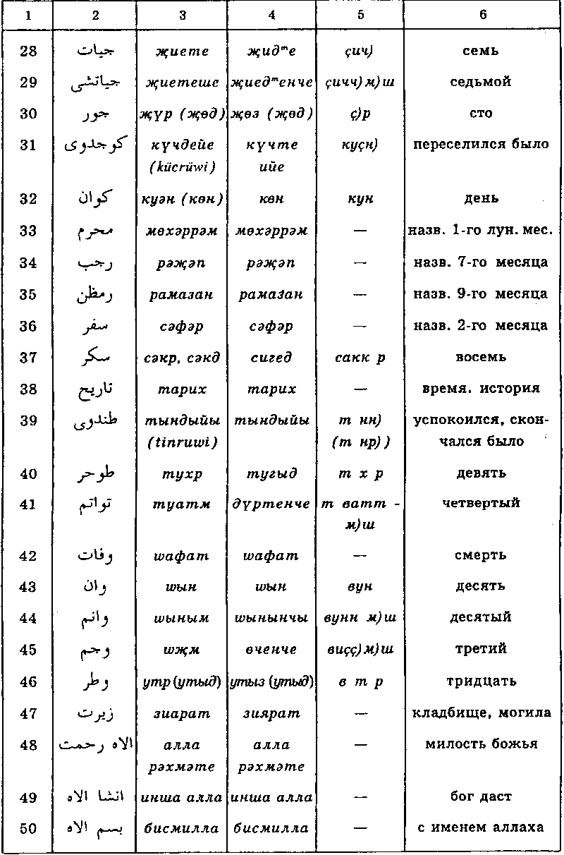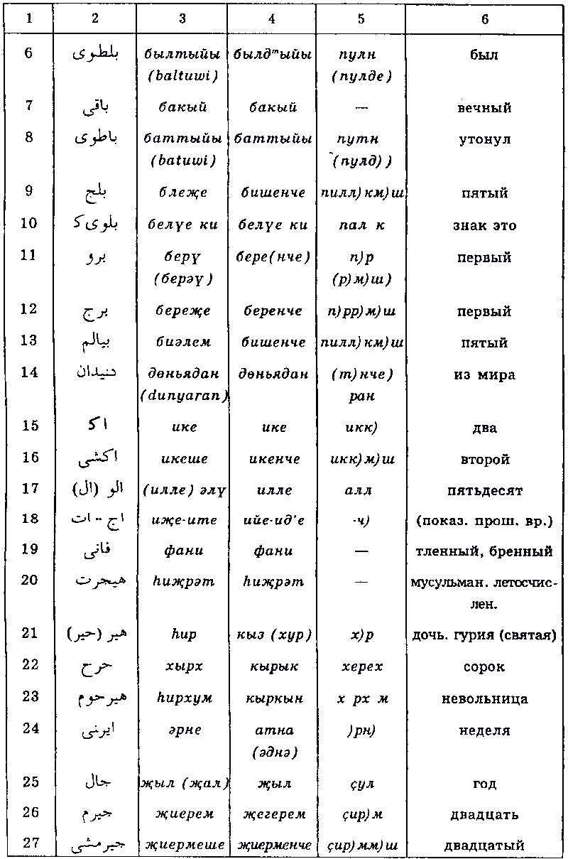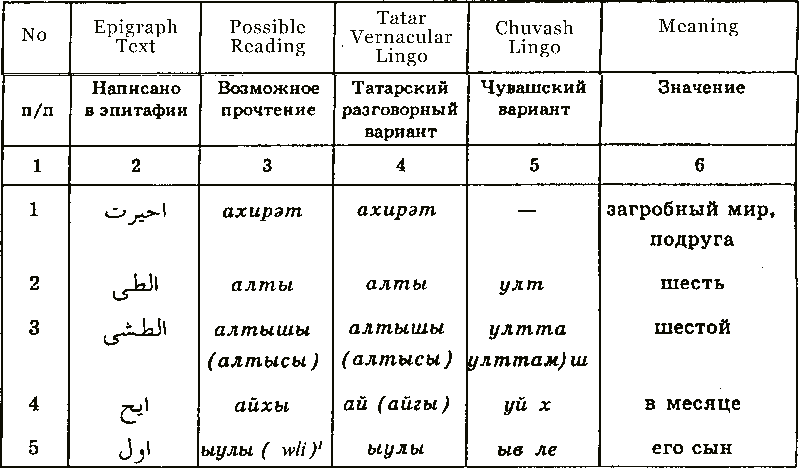 To prove the affinity of the epitaph language with the Chuvash language, usually are selected only those epitaphs that can have some relation with the matching Chuvash lexemes. In addition, the scope of comparison usually excise the Tatar (and especially colloquial) language which has developed in the territory of the Bulgarian state, and has a direct relation to the language of the Bulgarian epitaphs. At best are included either the Ancient Türkic language, or the Türkic literary language introduced to the Itil region from the Karahanid state, which could hardly have any direct relation to the language of the epitaph. Such research technique, introduced by N.I.Ashmarin in his time, is adhered by all supporters of the Bulgaro-Chuvash theory. In view of that situation, for comparison in the table are included the words of the Tatar spoken language. In addition, we gave new versions for the reading of some words coincidental with the Tatar dialectal words. However in the first version of the comparative analysis we have included the currently universally accepted rendering of the words, correcting only the obvious mistakes. The first version of the lexical analysis is below: 1. 15 words of the epitaph, borrowed from the Arabian language, are included in the lexical fund of the Tatar language, they were actively used in the Old Tatarian, and are used in the modern Tatar language, they even penetrated the spoken language. If the Chuvash language represented a continuation of the Bulgarian, it would retain at least one of these loanwords. 2. All other words of the Türkic root in some form can be found both in the Tatar, and in the Chuvash languages, with exception, perhaps, of two words: bledje (fifth), tuatm (fourth). The Tatar language does not have these roots with the same meaning. The root of the word bledje was preserved in the word belək (hand). The root of the second word tuatm probably ascends to the word dürt that was significantly changed in the illiterate dialectal vernacular. Anyway, these two words were more distinctly preserved in the Chuvash language. 3. 22 words were preserved both in the Tatar, and in the Chuvash languages, but phonetically they are much closer to their Tatar verbal matches: alty, altyshy, uly, byltyiy (buldy iye), battyiy, belüe ki, berü, beredje, ike, ikeshe, ite (idje/iye), djal (djyl), djierme, djiermeshe, djiete, djieteshe, küchdeye, kön, tyndyiy, uyn, uynym, üdjem (öchem). 4. 11 words were preserved both in the Chuvash, and in the Tatar languages, but phonetically they are much closer to their Chuvash equivalents: aikhy, biélem, éllü, khyrykh, hurkhum, sékr, tukhr, djur, utyr, irne, hur. Thus, the first version of the lexical analysis of the 50 sample words gives the following picture. Only in the Tatar language had preserved 30% , only in Chuvash language had preserved 4% of the words. The other 66% of the words are in both languages, however 2/3 of them are much closer to the Tatar language. In the result, of the 50 words in the epitaphs, 74%, i.e. three quarters, are closer to the Tatar language, and 26%, i.e. just one fourth, are closer to the Chuvash language. And it is natural: the analysis of any ancient Türkic text would give a similar picture, for the Tatar and Chuvash languages are both Türkic. Therefore from the analysis should be made a conclusion about the affinity of the epitaph language of this group (2-nd type) to both the Tatar at large (common Türkic) language, and the Chuvash language. We can only state the influence of the Chuvash type language upon the language of the (2-nd type) epitaphs. Apparently, such influence became possible, only because the Chuvashes (Suaslamaris) served as masters, manufacturers of the tombstones, and they, being Moslems, then assimilated among the common Türkic-speaking Bulgars. The final assimilation of the Moslem Chuvashes took place sometime in the 60es of the 14th century, because the latest monument written in the Chuvash-similar language was dated by 1361. And this type of the monuments rather abruptly disappeared, which is difficult to explain only by the assimilation processes, because the linguistic processes in the society do not happen instantly. In the 1361 the Bulgarian Ulus was completely ravaged by the armies of the Altyn Orda Khan Bulat-Timur, which apparently was a direct reason for the disappearance of the orthodox traditions. Exactly then the manufacture of the gravestones, both of the first, and of the second type has stopped. Later, only after twenty years, that is in the 1380es, began to appear again the stone stelae, but they already were of a mixed type and without Chivashisms. Obviously, by then the new generation of the artisans has completely lost the Chuvash language. Though individual representatives of the Chuvash people were converting to Islam after that, but they did not do it any more by the whole communities, but only one by one, and in addition knowing beforehand the Bulgaro-Tatar language. Therefore the later epitaphs were written only exclusively in the Bulgaro-Tatar or in the Arabian languages. (Note that the Arabic script was the script of the Itil Bulgar/Tatar nation for a millennia, from ca. 900 to ca. 1930 AD, the Arabic language was taught as a main subject in schools and medresse, and the girls were customarily taught literacy along with the boys for at least a couple of hundred of years before the 1930 - Translator's Note) Thus, the analysis of the Bulgarian epitaphs' language proves that this epigraphy cannot support the adequacy of the Bulgaro-Chuvash concept. 101. How and why A.P.Kovalevsky "found" Chivashisms in the Ibn-Fadlan work? The "Chuvash" words preserved in the ancient notes by Ibn-Fadlan about his trip to the Bulgaria are considered to be another argument "proving" the Chuvash-linguality of the Bulgars. This author, who in 921-922 made a voyage from Bagdad to the Bulgaria with the Arabian embassy, wrote down during the trip the