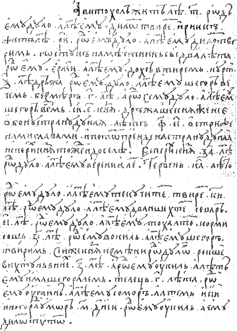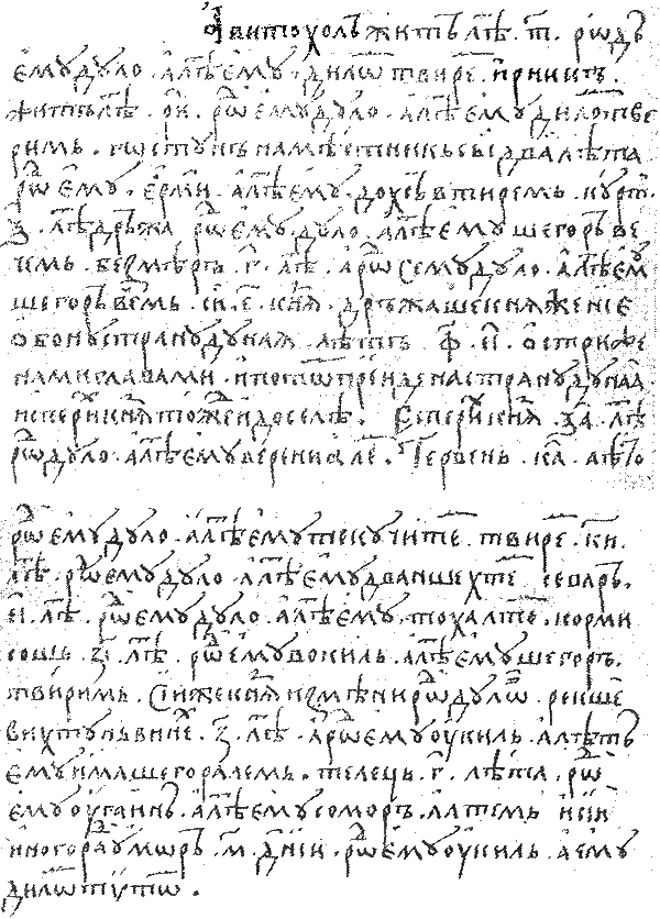 There are two theories about the source of the Khanslist. One, advanced by M. Moskov among others, is that the Khanslist originated as an inscription in Greek and was later translated into Slavic and rendered into Cyrillic, the Slavic text is a clumsy translation from the Greek (M. Moskov, Imennik na bylgarskite hanove, Sofia, 1988). The other is that the Khanslist originated as an inscription in the Bulgarian Türkic, and was later translated into Slavonic and rendered into Cyrillic. In favor of the Türkic origin point a number of telltale signs preserved in the manuscript. The most prominent feature preserved in the manuscript is the phenomenon of dot separators between the words. This is a unique and well documented aspect of the Türkic writing. In the Greco-Slavic theory, the dot separators are ignored and skipped without analysis. The second prominent feature is the location of the first word, Atilla, in respect to the rest of the manuscript. It indicates that the original was written right-to-left, distinctive for the Türkic writing and opposite to that of the contemporary Greek and later Cyrillic. The third is the placement of the title “Khan” following the name “Atila”. Unlike the Greek and Slavic, where the title would precede the name, in Türkic the title follows the name. Customarily, the title is agglutinated to the name, creating a myriad of well-known composites like Chingizkhan, Batu-khan, Kur-Batyr, Kur-Amir, Kurbat, Shambat, Aley-bat, Jani-Bek, Berdi-Bek, Gali-bey, Elchibey, Malikshakh, etc. In contrast, the concoctions like Charles-king, Michael-basileus, or Nicolay-tsar do not exist. The fourth feature is the absence of the space separator convention traditional in the Greek and passed on to Slavic Cyrillic. While the Slavic portion of the translation shows space separators, the Bulgarian un-translated sections retain no separation, like in “dilomtrvirem”, or use a dot separator. What looks like a clumsy translation from the Greek would make a natural translation from an agglutinative language, where the fifth feature mirrors the brevity and expressiveness of the agglutinated words, with indicators “emu = his”, “imya = has” suffixed to the root and not forming separate words, unlike the texts rendered into Greek or Slavic. The use of the word “imya = has” in Slavic is well illustrated by the phrase “Ïðîèçîøëà îò ñèõ äâóõ áðàòîâ ôàìèëèÿ î÷åíü ìíîãî÷èñëåííàÿ, êîòîðàÿ íàëîæèëà ñåáå èìÿ (name) îò ïîêîëåíèÿ ×åíàññîâ, äëÿ òîãî ÷òî èõ ïðåäêè èìÿ (had) ïðîçâèùå ×åíà” (“Descended from these two brothers family very numerous, which imposed on itself a name (imya) from the generation of Chenasses, because their ancestors had (imya) a name Chena”) [Russian translation of Abulgazi “Genealogy of Tatars”, original publication, 1778, Vol. 1, p. 195]. The sixth feature is the trace of the syllabic writing, where the vowels are included in the consonants by convention, and only those vowels that are needed for clarity are indicated, like the initial “A” in Atila or “E” in Esperikh. Once a first vowel is indicated, the trailing vowels follow the law of the vowel harmony, and customarily are not indicated. However, to render the word in Greek or Slavic, the translator would have to “re-invent” the missing vowels. A quick look at the Baichorov's table would suggest how that dynastic name could be spelled in Türkic. Two consonants, “ql”, would adequately represent “Ukil” in Bulgarian, but would be rendered as Ukil, Ugil, Vokil, Oukil, Ougain and Uokil in Greek and Slavic. Another trait of the syllabic writing, the indiscriminate carryovers to the next line resemble little the tidiness of the Greek inscriptions, but are conspicuous in the syllabic Bulgarian Türkic inscriptions. The diacritic marks are typical for the syllabic writing and do not have explanation as Greek or Cyrillic ”ö” and “ü”. The diacritic location of some consonants may be explained as typical for Greek or Cyrillic, but it also may be a close rendering of the Türkic syllabic words. The Bulgarian Türkic writing employed non-alphabetical symbols and conventional abbreviations which could have been used in the slab inscription. The equivalent of the “rule, ruled, ruler” could be one of these signs. In that case, the translation “khan, knyaz, khyaz'ed” would not be a literal translation, but a semantical rendering. The same type of convention could be used to write “Kurbat” as “Kur(ba)t”, with the “ba” syllable omitted in written, but not in the spoken language. An interesting feature that would suggest a Greek original is the use of the “ou” diphthong. I. Mladjov provides the following explanation: “OU” (“OY”) is the standard Greek way of rendering the sound “u” (as in sugar). The Cyrillic took over the entire Greek alphabet, the sound “u” was written as in Greek with combination “OU” (“OY”) or with a ligature which looks like figure “8” but is open on the top. Eventually this was simplified into the Cyrillic letter that looks like Latin Y. But that letter, used in the Middle Ages without “O” in front of it, would not give the sound “U”, but the sound “Y” (“I”, “EE”) as in Greek.” This explanation of the “ou” diphthong serving as a substitute for “u” excludes the necessity for a Greek intermediary, whether a Greek scribe for an oral narrative or a Greek inscription, and supports the concept that the translation was made directly from the Türkic original. The opinion of the experts that the manuscript is a translated copy of a stone slab inscription, and the first four uniquely symptomatic features discussed above lead to a conclusion that the source of the manuscript was a stone slab with Türkic inscription. One day, maybe, we will see the original