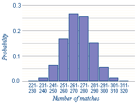 This looks a lot like a normal distribution, and in fact it is one, if np and n(1-p) are both over 5. (For typical lexicon sizes, the distribution will be normal if p > .01.) The 'expected case'-- the number of matches with the highest probability-- will be np; in the above case, 270, with a probability of .0284. I will suggest refinements to this model below, but the basic features are in place: a probability for a single match; a calculation for number of expected matches; and an adjustment for phonetic and semantic leeway. Vocabulary size and other variablesWhat happens as various parameters of the model are changed?In the model above, vocabulary size is not independent of the sample phonology. If syllables are all CVC, with 5 vowels and 14 consonants, then there are only 980 phonologically possible words. If we use a larger vocabulary size in the formula, we are conceptually re-using some of these possible words. This might not be a bad model for a language with many homonyms, or if we are simply ignoring some of the phonology of the language (e.g. tones, or final vowels). We can also try different phonologies. For instance, here are a the numbers of expected matches for a few different word types, again allowing 3 matches per sound, and 10 semantic matches per word: The number of matches isn't increasing as fast as the vocabulary size. For instance, as we go from CVC to CVCV, we increase the lexicon fivefold (for each CVC syllable, there are 5 CVCV syllables, one with each vowel), while the number of matches only increases threefold (the extra vowel can be matched only 3 ways). (For the first (CV) case, the expected number of matches is larger than the lexicon size! This is because, with the rules as stated, we're often going to find more than one match per word. We'll come back to this later.) What about exact matches? Curiously, the number of exact matches averages about 1 for any phonology, and therefore for widely differing vocabulary sizes. The reason is not hard to find: as the lexicon size increases, the chance of a given match goes down, but we get more chances. (The average of 1 exact match needs to be qualified, because of homonymy: a word can have several meanings, and thus match several possible words. In effect, languages come with a built-in semantic leeway; a handful of exact matches is therefore no surprise.) What about different phoneme inventories? What if we have 20 consonants and 10 vowels? There are now 4000 possible CVC syllables; yet without varying any other parameters, we would still expect only 270 matches. But the number of phonetic matches is not really independent of the phonology we use. In a five-vowel system, a phonetic leeway of 3 per sound matches means (e.g.) accepting pat and pit as matches for pet. In a ten-vowel system, might we not also accept pEt (open e) and pöt (rounded e) as well? Contrariwise, suppose there are only 3 vowels, as in Quechua or Classical Arabic. A 3-vowel leeway means that all vowels match all vowels! Here's some 20C/10V languages with a few different phonetic leeways (and the same semantic leeway of 10): The reader may well conclude that with the appropriate choice of parameters, any number of matches is possible! That would be more or less accurate; but note:
