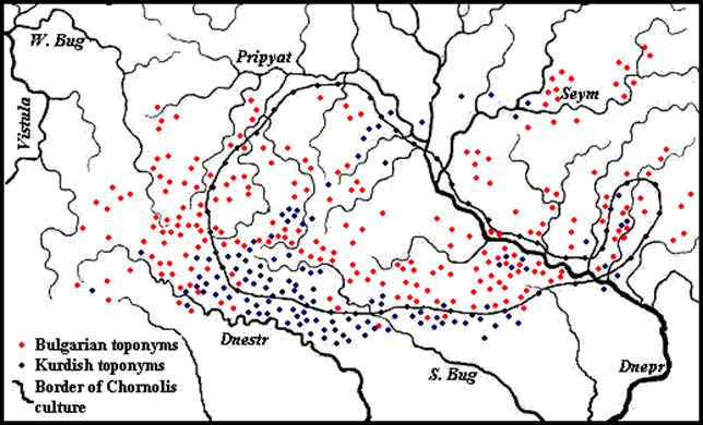 We know, that Proto-Bulgars moved to the right bank of the Dnieper from the end of 3-rd mill. B.C. First they have occupied only the steppe, but have promoted also in the forest-steppe strip later. This fact can to be testified by lexical coincidences between German and Chuvash languages (Stetsyuk V.,1998, 85-86). The hypothetical territory of Bulgar’s settlement should be somewhere to the south of the area of ancient Tuetons, that is in the basin of the upper Dniester, the rivers Vereschitsia, Zolota Lypa, Strypa. Bulgars stay in this territory can be proved by numerous toponymics. This theme has been considered in corresponding work more detailed (Stetyuk V., 2002, 13-20). Here it is possible to specify only that one the of congestions of Scythian toponymics is in the territory of the Cherepyn-Lahodiv group of archaeological remains which L. Krushelnytska binds with the Early-Scythian culture. On the whole, the greatest congestion of Bulgarian toponymics has been revealed on territory of the Lvov Region and further to the east up to the river the Hnyla Lypa though it is certified on all territory forest-steppe Rightbank Ukraine where it adjoins to the toponymics of Kurdish type. Thus Bulgarian toponymics lasts as the expressed chain up to Dnieper, passes it in the area of the river Vorskla’s mouth, further goes upwards the Vorskla, and then gradually becomes sparse. Also what is the most surprising, that the general area of Bulgarian and Kurdish toponymics mostly coincides with area the of the Chornolis culture together with the characteristic tongue on the Vorskla (see Fig.3). There is no doubt that exactly on this territory ancient Bulgars and Kurds lived in the close neighbourhood and this can be been displayed confirmed by numerous lexical parallels between Chuvash and Kurdish languages (see the previous chapter). As other ethnic groups were not present at the Rightbank Ukraine at this time, one may believe that creators of the ethnically not identified Chornolis culture could be only Proto-Bulgars and Proto-Kurds. Estimating of the proportional contribution of both ethnoses into this culture is difficult at present, but on all signs it seems to be that the leading role played Proto-Bulgars. Having taken into account the fact and the chronological frameworks of evolution of the Chernolis cultures to the Early-Scythian culture, one may go further to assume that Scythians should be identified with Bulgars and Kurds as creators of Early-Scythian culture in the Ukrainian Forest-steppe down to the Carpathian Mountains and the river San. According to toponimics, the nucleus of the Scythian culture began to arise on the banks of the left tributaries of the Dniester – the rivers Vereschitsia, Hnyla Lypa, Zolota Lypa, Strypa, Seret. Obviously, the well-known Scythian gold was extracted in the basin of these rivers as the numerous toponymics, which can testify former rich deposits of this metal, concentrates here (the Ukrainian root “zoloto” (gold) may be find in the names of the rivers Zolota Lypa, Zolota, the settlements of Zolochev, two villages of Zolochivka, of Zolotniks, of Zoloty Potik, of Ivane-Zolote, of Bilche-Zolote, of Zolota Sloboda).