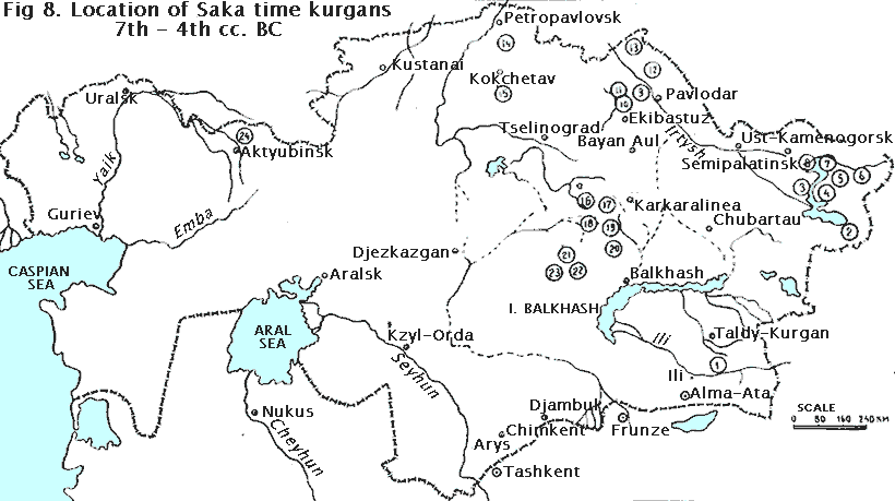 skulls] Individual description of skulls also shows that the anthropological type of Tasmolin Culture tribes included a Mongoloid admixture. The influence of Mongoloid gene on the local Caucasoid population has been also noted in other series of skulls of that time (Debets, 1948; Ginzburg, 1961). Some local distinctions between separate territorial groups of the Saka tribes are clearly pronounced. Regrettably, the majority of compared series is smallish. However, the difference between the Central Kazakhstan and East Kazakhstan groups is obvious. The East Kazakhstan groups have wide face, flattish face skeleton, weak protrusion of nose. These attributes tell about significant admixture of Mongoloids in the Ust-Bukon groups. The skulls from Northern Kazakhstan have Mongoloid features expressed even more distinctly than in Ust-Bukon series. However, because of a small number of skulls from the Northern Kazakhstan we do not have a complete confidence in the observations. Nevertheless, the Mongoloid admixture in anthropological composition of the Saka tribes does not raise any doubts. Thus, the tribes of 7th-4th centuries BC (Saka time) in anthropological relation were not homogeneous. But nevertheless a prevailing component during the that period was an ancient Kazakhstan Caucasoid type and forms close to it. In summary, the paleoanthropological material of the 7th-4th centuries BC (Saka time) in Kazakhstan accumulated 60 skulls (38 male and 22 female), including those studied by G.F.Debets, V.V.Ginzburg and the author. Fig. 8 Locations of the 7th-4th centuries BC (Saka time) burials where skulls were collected are shown on the map (Fig. 8).