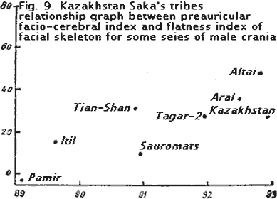 deliberate antic). The skulls of Tagar Culture (II stage), investigated by V.P.Alekseev (1961), are morphologically closer to the skulls of the Saka Culture of Kazakhstan, and differ from them only by a smaller cranial index, higher cranial, more upright forehead, and some other traits. As for the main linear dimensions of the face skeleton, they are close between themselves, which probably is connected with the anthropological features of the initial proto-Caucasoid forms. Comparison of the studied series with the series of Sauromat skulls from the Lower Itil region (Firshtein, 1961) exhibit distinctions in many traits. So, the Kazakhstan skulls have more expressed brachicrania, lower cranium, relatively higher and less protruding nose. Generally, in our series the Caucasoid features are weaker. At last, the skulls of the Saka Culture were compared with the series of , studied by G.F.Debets. It turned out that the Dniepr basin Scythian skulls differ from the Kazakhstan Sakas mainly in the linear sizes of the crania and facial skeleton (the high crania, dolichocranial type, significantly narrow and upright forehead, narrower and more profiled face, more protruding nose and lower orbits). The Mongoloid traces in the physical appearance of the 7th-4th centuries BC (Saka time) tribes in Kazakhstan are more pronounced.. The comparative characteristic of the Kazakhstan Saka's tribes is complemented by a relationship graph between preauricular facio-cerebral index and flatness index of facial skeleton (Fig. 9). This combined method was offered by G.F.Debets (1964, 1968) to differentiate the Caucasoid and Mongoloid groups (A curious reader should ensure that he enjoyed the substance, scientific depth, and significance of the Debets' "Mongoloidness Index". It is too minacious and portentous to be reduced to a brief vile comment). Fig. 9. Kazakhstan Saka's tribes