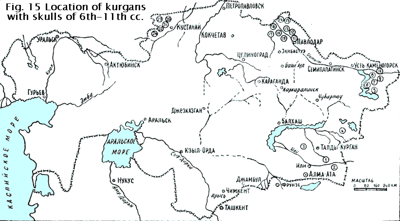 домашних животных в них. Археологические материалы тюркского времени имеют преемственность с материалами предшествующего времени. Вместе с тем они обнаруживают близкие аналогии с культурами синхронных племен Сибири, Алтая, Нижнего Поволжья и Заволжья (Черников, 1962; Агеева, Максимова, 1959; Арсланова, 1964). Это подтверждают данные по антропологии тюркского времени. Имеющиеся сведения достаточны для воссоздания истории расового состава того периода. Большая часть палеоантропологического материала получена из раскопок С С. Черникова в Восточном Казахстане. Выявленные им черепа относятся к Тюркам-Кимакам. Небольшая серия тюркского времени имеется также из Северного и Западного Казахстана. Эти материалы описаны В. В. Гинзбургом (1958, 1960, 1963). Он выявил разную степень смешанности антропологического состава населения тюркского времени. Так, тюрки-кочевники Восточного Казахстана имели большую европеоидную примесь, чем тюрки-кочевники Северного Казахстана. Последние обладали хорошо выраженными промежуточными чертами южносибирской расы, которая, по существу, является результатом смешения раннетюркских кочевых племен с местными насельниками Казахстана и Южной Сибири (Гинзбург, 1956, 1960, 1963). Рис. 15 Местонахождение могильников, которые дали палеоантропологический материал тюркского времени, указано на карте. По суммарным данным, мужская группа характеризуется среднепродольным и поперечным диаметрами, мезокранным указателем. Однако в серии наряду с долихо- и мезокранными всречаются черепа ярко выраженного брахикранного типа. В женской группе черепная коробка исключительно брахикранная. Величина высотного диаметра средняя. Общая форма мозговой коробки широко варьирует от эллипсоидной до сфероидной. Лоб средней ширины, по наклону он