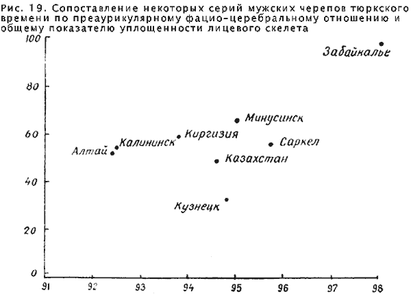 19). Рис. 19. Сопоставление некоторых серий мужских черепов тюркского времени по преаурикулярному фацио-церебральному отношению и общему показателю уплощенности лицевого скелета.