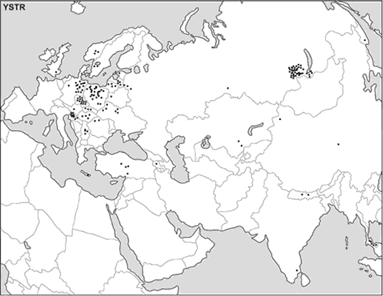 The S24/S34 haplotype is mainly found in Poland and Germany (In the Late Antique time, territories of both Poland and eastern Germany had significant Türkic presence, which may explain their falling into a single class. Poland had a considerable influx of Türkic people in the Middle Age, but Germany did not.) In Asia it is found in Anatolia, Armenia, Nepal and India (Except for Nepal, three others had significant Türkic presence). Haplotype of specimen S26 has a wide distribution since it appears in Europe as well as in western Asia, in Central Asia, in southern Asia and in southern Siberia. The allelic structure 16-24-11-11-13 (DYS19, DYS390, DYS391, DYS392, DYS393) found in this haplotype was described as the most frequent motif observed in a Ukrainian population by Kravchenko et al. (2002). According to these authors, this 5 Y-STR-loci haplotype might be an ancestral one (Ukraine was a permanent home of a number of Türkic populations). Haplotype S28 is the most frequently found in present-day populations. It is essentially carried by eastern and northern Europe individuals, as well as south Siberians (Footprint coincides with European Sarmatia and European Huns). The S32 haplotype was not found in the databases even though it differs from the S24/S34 haplotype by only one-step mutation at locus DYS392. The S07 haplotype also did not appear in the YHRD database even when one mismatch was allowed in the minimal haplotype search. The current distribution pattern of all the Y-STR haplotypes found in our ancient sample is reported in the map on Fig. 2. Fig. 2 Current distribution pattern of the Y-STR haplotypes found in the