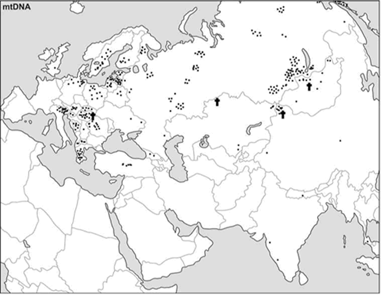 The fact that East Asian mtDNA sequences appeared at the Iron Age could signify that once settled, migrants of supposed European ancestry (i.e. anthropologically and genetically Caucasoid ancestry) began to establish relationships with groups coming from the east and to take Asian women as wives. Moreover, the relative high diversity of the mtDNA gene pool observed in the ancient specimens indicates that numerous populations carrying different mtDNA variants were involved in the formation of southern Siberian populations, even reflecting long-distant movements. It would not have presented any major difficulty for Bronze Age and Early Iron Age peoples to range from one end of Eurasia to the other within some centuries. Historical records and archaeology attest that nomadic groups moved across Eurasia from North of the Black sea, through Central and Inner Asia, to northeast Asia in a matter of centuries (Mair 2005). Some of them are described in Chinese historiography as horse-riding, Caucasian-looking, Indo-European-speaking people (allusion that Chinese described Hu, Juns, and Huns as Indo-European-speaking people is, naturally, totally false) and are sometimes referred as the "Kurgan Culture" (Zerjal et al. 2002) (for a simple reason that they buried their dead in kurgans). Paleogeographic studies provide material which suggests that climate change, particularly in the eastern regions of the steppes, was among the causes of these population movements (Van Geel et al. 2004) (in addition to the genocidal Chinese campaigns of divide and rule so vividly described in the Chinese annals). If we consider that there is a correspondence between the overall distribution of haplotypes and haplogroups and past human movements, it seems that the European or Caucasoid component observed in the ancient Siberian sample may originate from East European populations. Moreover, it is likely that some mtDNA lineages were carried to southern Siberia from the Volga-Ural region. Incidentally, in the fifth century BC, Herodotus mentioned transit trade occurring in Central Asia along a route that stretched from the Urals in the west to the Altai and the Minusinsk Basin in the east (Hemphill and Mallory 2004). In Altai, the presence of the R1a1 haplogroup in the middle of the fifth century BC is confirmed by the sample SEB 96K2 of Ricaut et al. (2004) which was found to belong to this Y-haplogroup. The boundary of the eastern European influence seems to be fixed at the peri-Baikal area since no R1a1 haplogroup was found in the Hun (orig.:Xiongnu) specimens of the Northern border of Mongolia (For mobile nomadic people this absence of R1a1 haplogroup and any boundaries are nonsense, see for example K.Kim 2010). According to the "Kurgan hypothesis" of Marija Gimbutas, nomadic peoples of the Volga steppe region, assumed to speak a Proto-Indo-European language, infiltrated Europe in three waves between 4400 and 2800 BC. Around 4400 BC, Kurgan people from the lower Dnieper and lower Volga regions began moving along the Black Sea littoral into the Danube Basin. They migrated in the Central Balkans and further into Central Europe. During the middle of the fourth millennium BC, the Kurgan culture in the North Pontic Region continued to develop. People travelled across western Ukraine north of the Carpathian Mountains to Poland and Central Germany. They also moved southwest into eastern Romania. Shortly after 3000 BC, the third Kurgan wave (Pit-Grave; orig.: Yamna people), originating once more from the Volga steppe, spread from Central Europe to Northwest Germany, the east Baltic area, southern Scandinavia, the upper Dnieper basin and Central Russia. These three waves of migrations might explain the distribution of mtDNA and Y-chromosome lineages observed in the present work (Figs. 2, 3) (that explanation would be a real Houdini-type achievement, since Gimbutas largely discredited theory of invasion waves brings Kurgans westward to Europe, not eastward to the Siberia of the present work. For the westward expansion, the consensus is that it was predominantly peaceful and symbiotic, which allowed deep penetration of the migrant's culture and innovations into the local diverse populations of the Central Europe and Balkans. Following the examples of the later expansions during the historical periods, of which we know hundreds, all of them, excluding those that joined kindered populations, lost their languages and now speak Scottish and English (Picts, Alans), Romanian (Scythians, Huns, Bulgars), Slavic (Badjanaks, Bulgars, Oguzes, many others), Hungarian (Scythians, Huns, Avars, Bulgars), Indian (Indo-Scythians, Kushans, Ephtalites, Mughals), Persian (Parthians, Mongols), Pashtu and Dari (Tochars, Ases, Sibirs, Ephtalites), Chinese (Huns, many others), Nakh (Tochars, Ases), Mongol (Huns), Armenian (Sakasena, Bulgars), Georgian (Kipchaks), Scandinavian (Sarmatians, Huns) and generally speaking any other language that borders the Eurasian steppes. Chances that the migrants imposed their language on the local populations are statistically non-existent. The study of Altaisms in the surrounding languages is in its incipience, but even the initial results are loud and clear, just recall that the Slavo-Turkic language of the "Tale of Igor's campaign" transitioned from the initial indignation and sensationalism to a thriving industry). The Andronovo culture was preceded by the Afanasievo one, which is held to share the closest similarities with the (Pit-Grave; orig.: Yamna) culture found in the Pontic-Caspian region (Hemphill and Mallory 2004). An eastward migration of the (Pit-Grave; orig.: Yamna)-derived Afanasievo populations in the Eastern steppe thus provides a possible explanation for the appearance of a European component (i.e. Cro-Magnon descent, a "robust" Caucasoid phenotype of the eastern European Pit-Gravers) in the gene pool of ancient south Siberians (do we have an understanding what was the gene pool of ancient south S