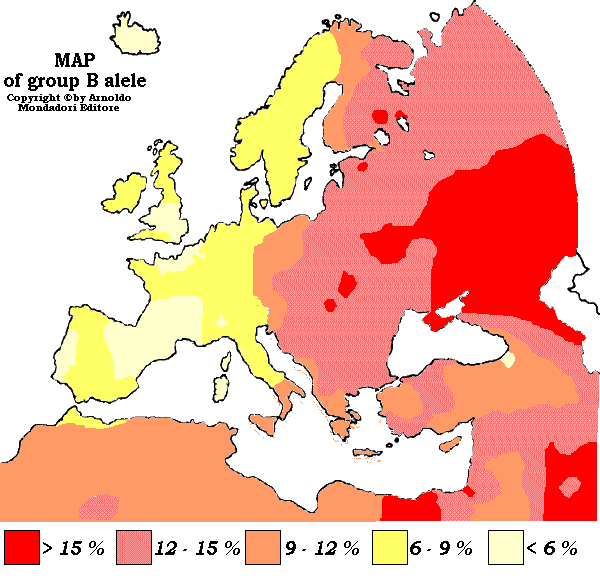 BLOOD TYPES Maps Distribution of the B type blood allele in native populations of the world