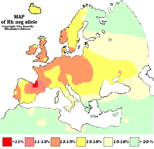 Distribution of the Rh neg type blood allele in native populations of Europe Distribution of the Third Genetic Component type blood allele in native populations of Europe