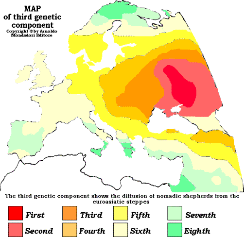 Le mappe genetiche di Cavalli Sforza Genetic maps of Cavalli Sforza Luca Cavalli Sforza, genetist of international reputation and a teacher of genetics in the Stanford University, has collected during the years an enormous quantity of genetic traits pertaining to the people of all the Earth. This data have been processed and reassembled in the genetic maps. These genetic maps are often spoken in the atmosphere of study, but it was thought it would be useful to render them available. The first two maps represent the distribution in Europe of two blood groups. The maps have been created with a complex mathematical processing, and indicate a series of genetic components, from the piu' strong to piu' weak, found in the genetic patrimony of the European people The first genetic component shows the diffusion of Neolithic agriculture. The second one possibly shows a genetic adaptation to the cold, but it is not certain. The third genetic component shows the diffusion of nomadic shepherds from the Euroasiatic steppes. The fourth shows the Greek expansion in the second and first millennium BC. The fifth genetic component indicates that Preneolithic populations which have not been absorbed from the Neolithic populations that came from the east Distribution of the B type blood allele in native populations of Europe