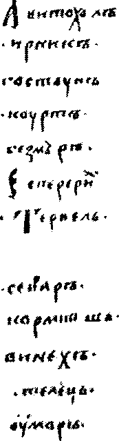 M. Moskov, Imennik na bylgarskite hanove, Sofia, 1988) who worked along the turkic hypothesis. According to him the original text of the nominalia must have been written in greek and the present (slavic) text we have is a rather clumsy translation from greek. So he, first, reconstructed the 'original' greek text, |