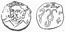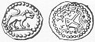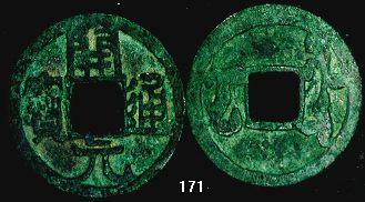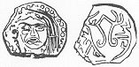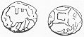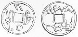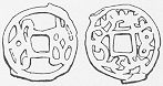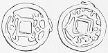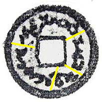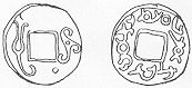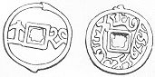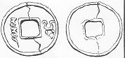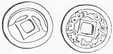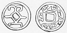 Larissa Baratowa, Tashkent: Old Turkic Coins of Central Asia http://www.onsnumis.org/news/jena99.shtml : Un-Iconographic Types The Old Turkic coins follow the principal design of the Chinese cash: a square hole in the center with inscriptions at its sides. The definition ‘Old Turkic’ derives from the names and titles which appear in the legends. These coins can be divided into classes, groups and types. The following picture emerges if we take into consideration the topography and stratigraphy of finds: