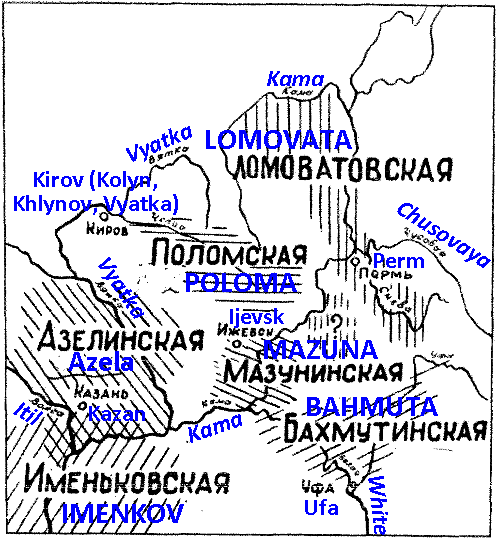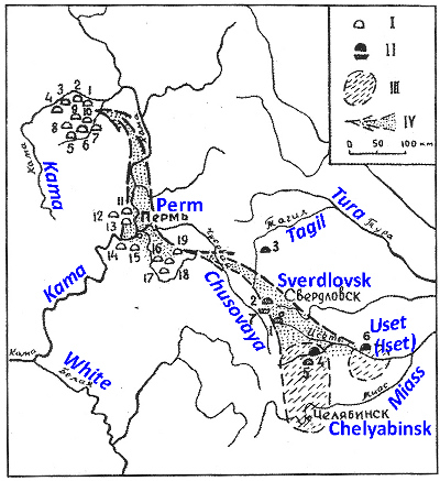 He noted the cultural affinity of the tribes, and wrote that Turayev-type ceramics is extremely close to that of the Imenkovo-type in the the Kama area, and suggested their synchronicity, i.e. simultaneous arrival of the Imenkov and Romanov-type ceramics with the Turayev-type ceramics and populations that occupied the entire Middle Itil, Lower Kama, and the middle course of the White river (Fig. 17).2 Indeed, later in the settlements of that region archaeologists found a large number of bronze ingots, including workshops for casting such ingots, with numerous finished products (in the Imenkov settlement) (Fig. 19).