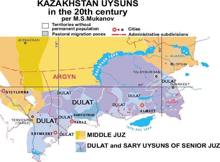 Dulat, numbering 250,000 people, is a most numerous subdivision, formally a tribe or a tribal confederation, in the Kazakh Senior Juz. It consists of the clans Botbai, Shymyr, Sikym, Yanys, Alban, and Suan. The Suan clan was mentioned in the Chinese dynastic chronicles under the name of the
